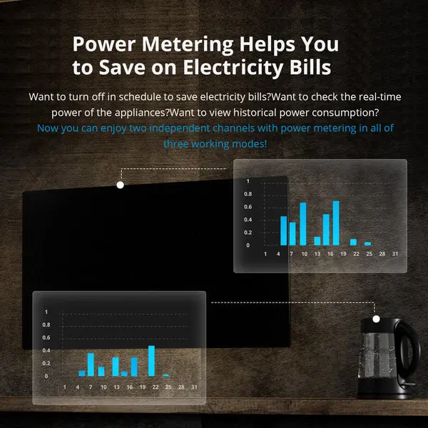 【Dual-Channel Power Metering – Track Energy Usage】Each channel independently measures voltage, current, and power consumption, helping you manage and optimize energy usage. (Note: Not available in DUALR3 Lite)