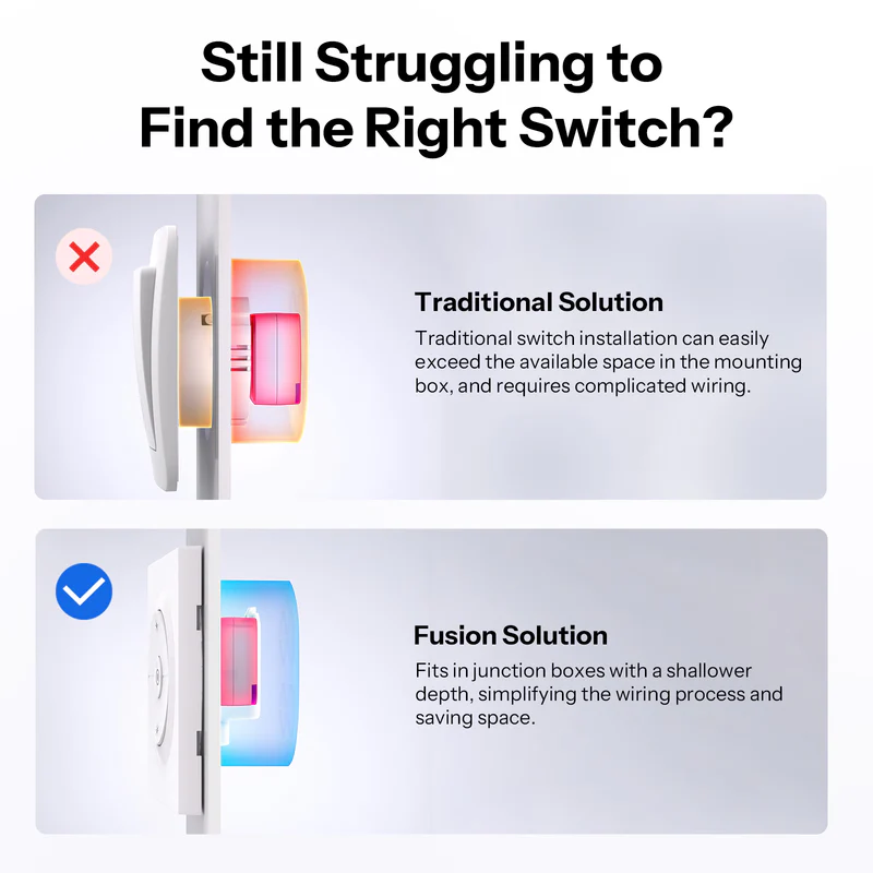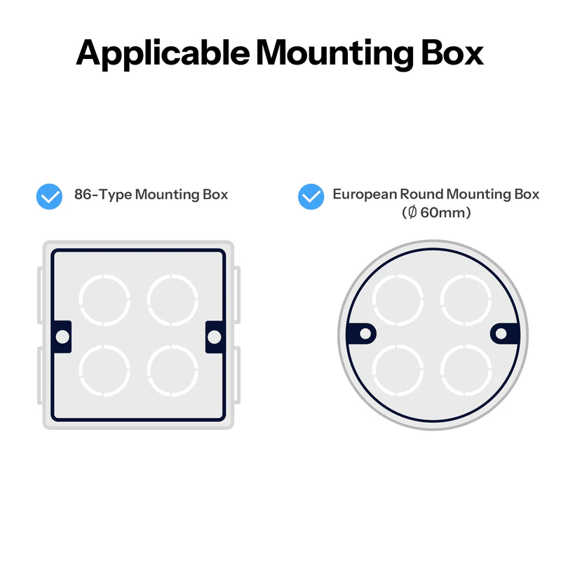 Fireproof, scratch-resistant, and durable without deformation over time. Simplifies wiring and securely locks the housing, reducing installation time. Only 21 mm deep inside the wall box, fully compatible with standard 86-type and European round mounting boxes (Ø60 mm).