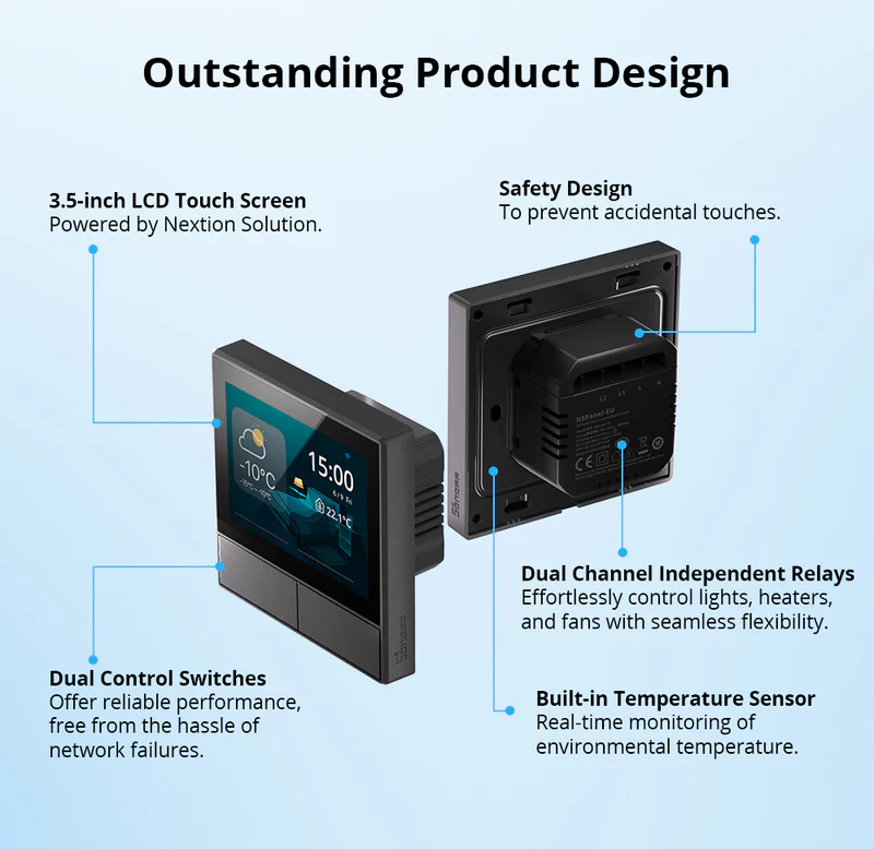 【Smart HMI Panel】Combining HMI control, temperature detection, and wall switch functionality, NSPanel brings seamless smart control to your home in one compact interface.