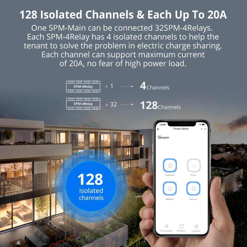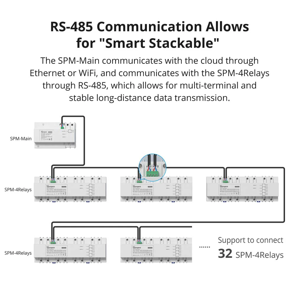 【UP to 32 SPM-4Relays】 One SPM-Main connects up to 32 SPM-4Relays. Each relay includes 4 isolated channels for organized and scalable device control.