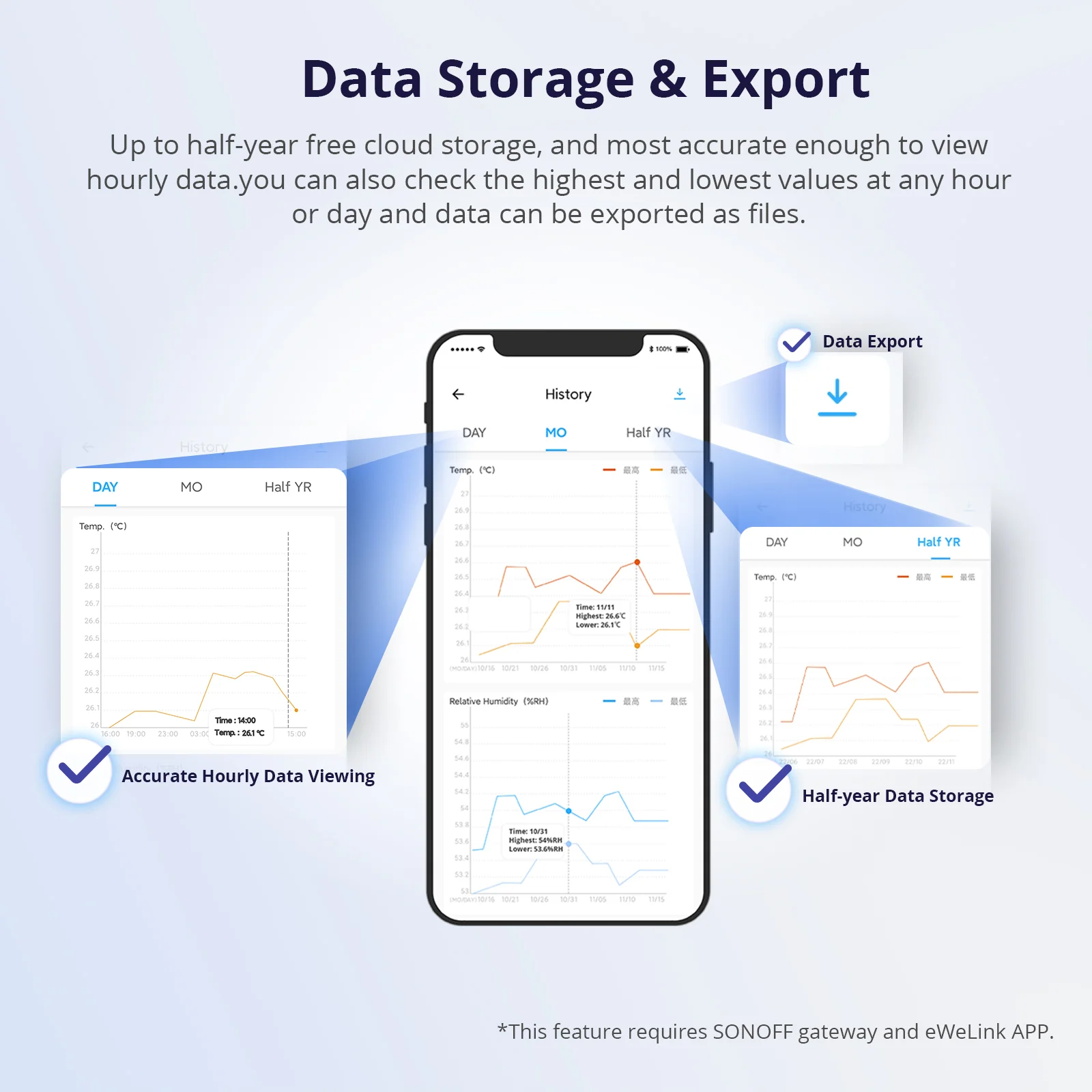 【Data Logging & Export】Includes up to 6 months of free cloud storage. View hourly trends, check historical highs and lows, and export data in file format for further analysis.