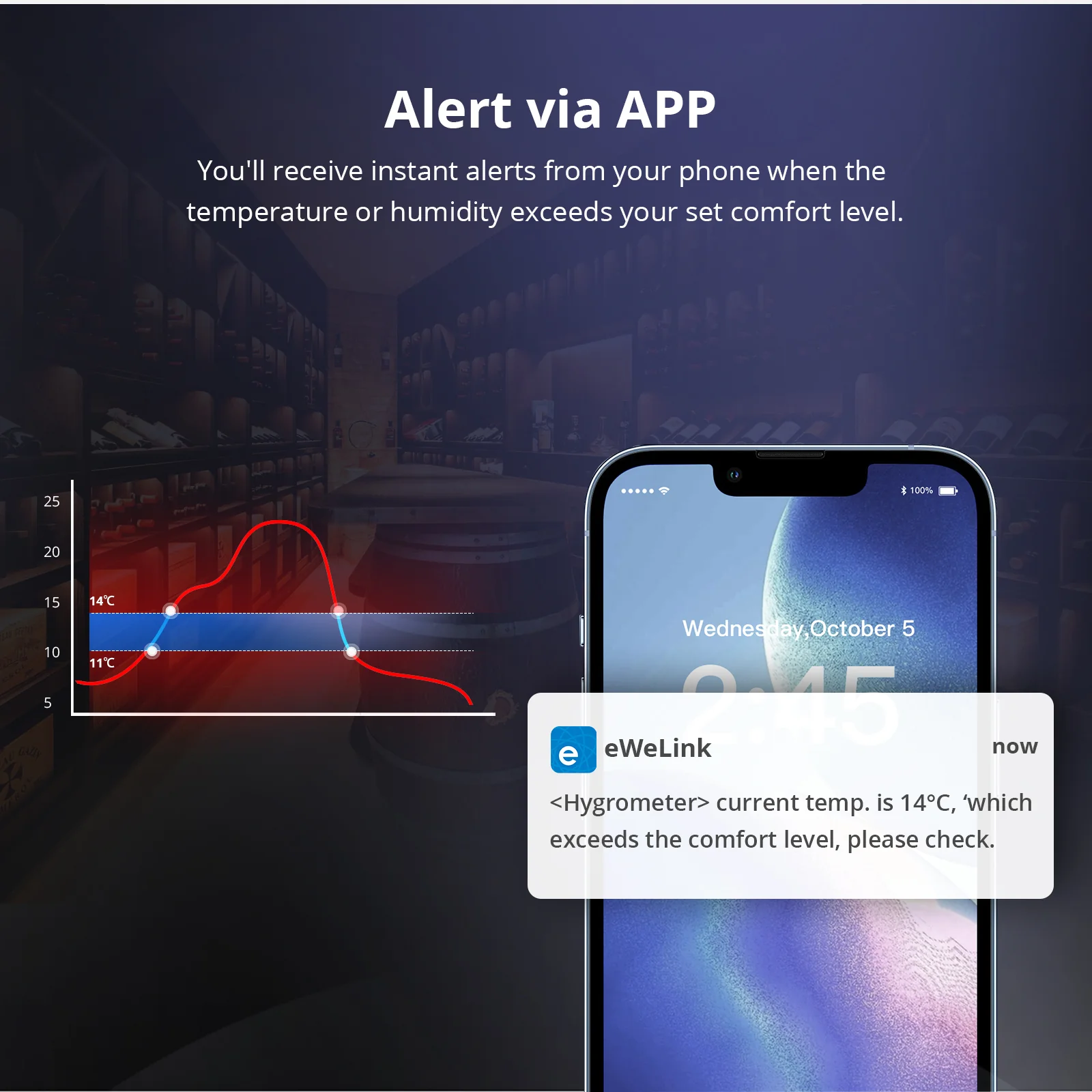 【Instant App Alerts】Receive push notifications on your phone when temperature or humidity levels go beyond your preset comfort range.