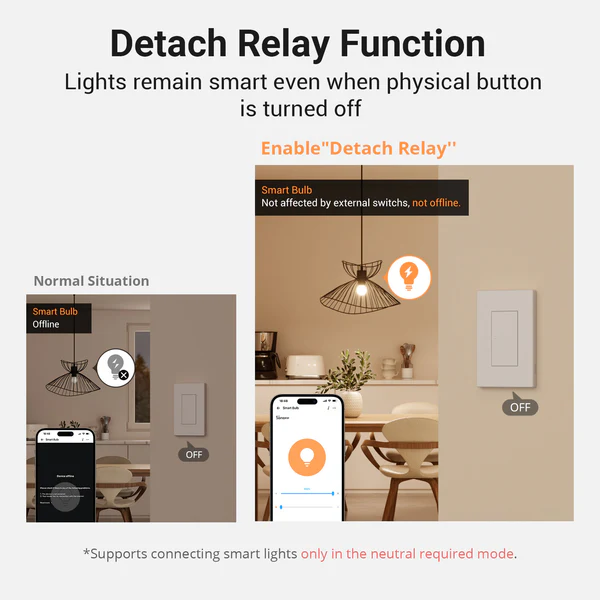 【Detach Relay Mode】 With this function enabled, you can still remotely control your smart devices through “Smart Scenes” even when the physical switch is turned off. And if the device goes offline, the physical switch instantly resumes full control.